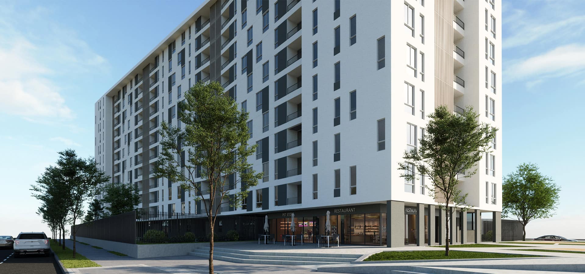Departamentos en 2 edificios de 12 pisos cada uno, separados por un área verde central. Cuenta con una placa de 13 locales comerciales y con una ubicación excepcional en Av. Américo Vespucio, justo en frente del Metro Las Torres.